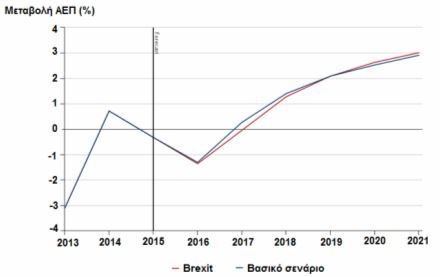 Οι επιδράσεις του ενδεχόμενου Brexit στην ελληνική οικονομία, παρουσιάζονται πολύ πιο συγκεκριμένα παρακάτω, με βάση τη μακροοικονομική ανάλυση που έχουμε κάνει με την Oxford Economics. Διαπιστώνεται ότι όταν ολοκληρωθεί το Brexit θα έχει κατά βάση υφεσιακές επιπτώσεις, έστω περιορισμένες, στην ελληνική οικονομία για τα επόμενα πέντε χρόνια. Ενδεικτικό είναι το Διάγραμμα 1 στο οποίο απεικονίζεται η εξέλιξη της μεγέθυνσης του ΑΕΠ για την ελληνική οικονομία.