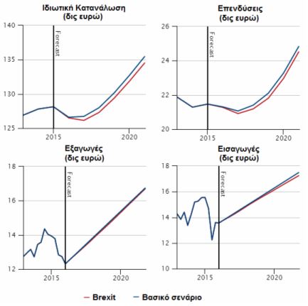 Το Διάγραμμα 2 συνοψίζει τις επιδράσεις του ενδεχόμενου Brexit στην ιδιωτική κατανάλωση, τις επενδύσεις, τις εισαγωγές και τις εξαγωγές.