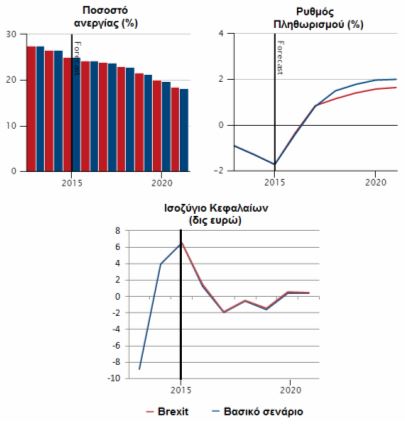 Με το ενδεχόμενο Brexit θα πρέπει να αναμένεται μια επιβράδυνση της απορρόφησης ανέργων κατά περίπου 10.000 άτομα κάθε χρόνο, καθώς το επίπεδο ανεργίας αναμένεται να είναι υψηλότερο κατά περίπου 0,2%. Επίσης, χαμηλότερο αναμένεται το επίπεδο του ρυθμό πληθωρισμού κατά περίπου 0,2% κάθε έτος. Τέλος, να σημειωθεί ότι θα πρέπει να αναμένεται ένα πολύ ελαφρά βελτιωμένο ισοζύγιο κεφαλαίων κατά περίπου 0,13 δις το χρόνο.