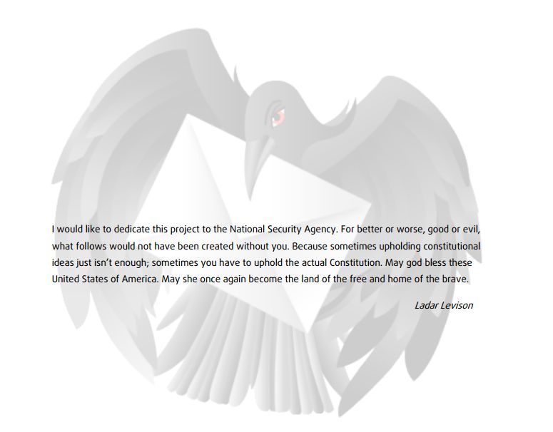 Με αυτό το μήνυμα, ο Λαντάρ Λέβισον προλογίζει την τεκμηρίωση της αρχιτεκτονικής μιας νέας υπηρεσίας ηλεκτρονικού ταχυδρομείου, στην οποία δεν θα εναπόκειται σε έναν η απόφαση να αποκαλύψει ή όχι ό,τι διακινείται. Ο Λέβισον αφιερώνει την εργασία αυτή στην NSA, αφού «χωρίς εσάς», δεν θα είχε γίνει.
