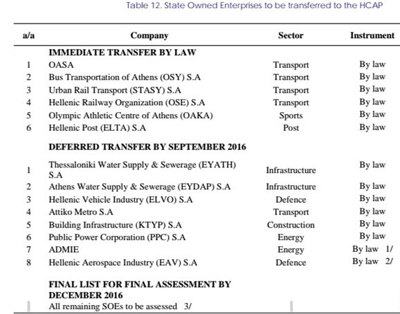 Στη συμφωνία με τους δανειστές προβλέπεται, επίσης, πως μέχρι τον Δεκέμβριο θα έχει διαμορφωθεί η λίστα ώστε να μεταφερθούν στο υπερταμείο όλες οι κρατικές εταιρείες.
