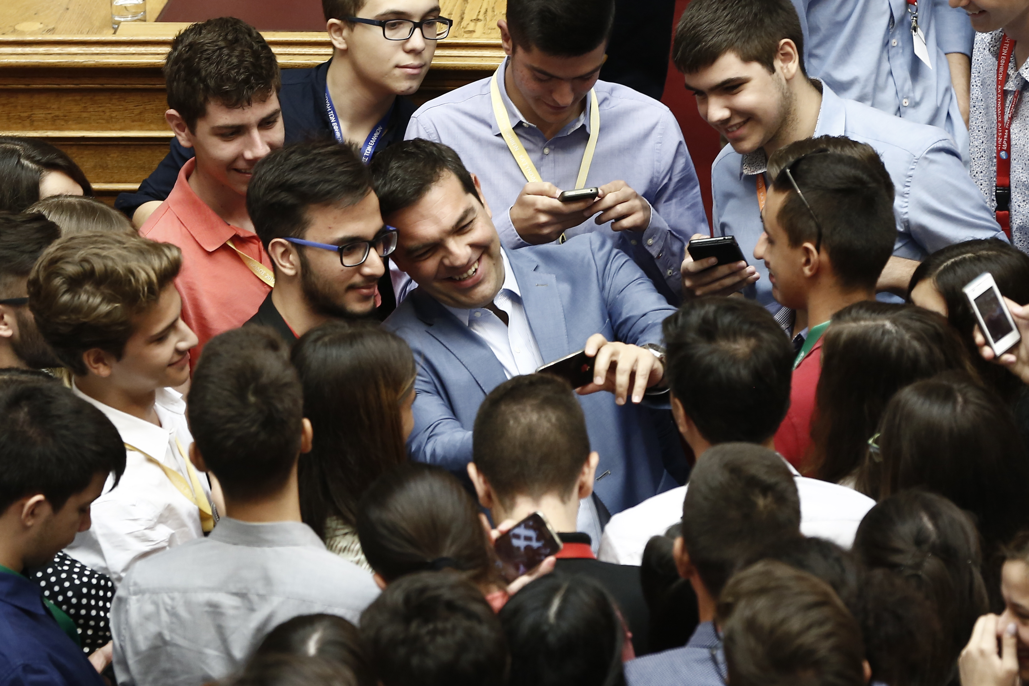 Ο πρωθυπουργός Αλέξης Τσίπρας βγάζει selfie με έφηβους βουλευτές