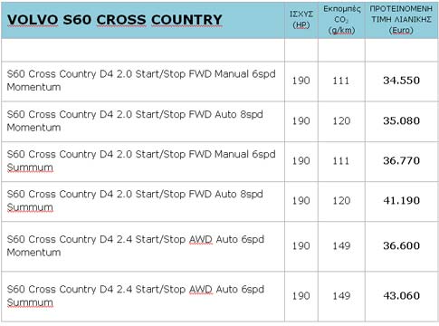 Αναλυτικότερα, υπό την ισχύ της νέας τιμολογιακής πολιτικής της Volvo Car Hellas, η βασική έκδοση των S60 και V60 Cross Country με το δίλιτρο τεχνολογίας Drive E κινητήρα ισχύος 190 ίππων σε συνδυασμό με μηχανικό κιβώτιο έξι σχέσεων ξεκινά πλέον από τα 34.550 ευρώ, ενώ για εκείνους που θα προτιμήσουν το νέο αυτόματο κιβώτιο οκτώ σχέσεων των Σουηδών, η επιπλέον επιβάρυνση αντιστοιχεί σε μόλις 530 ευρώ καθώς οι τιμές των αντίστοιχων αυτόματων εκδόσεων με τον παραπάνω κινητήρα διαμορφώνεται σε 35.080 ευρώ.