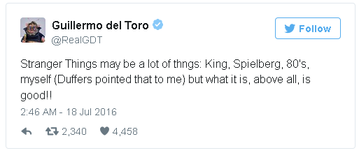 Επίσης, και ο μάστερ του τρόμου, Γκιγιέρμο Ντελ Τόρο, εξέφρασε την γνώμη του για την σειρά μέσω Twitter, λέγοντας πως μπορεί να περιέχει στοιχεία από τον Κινγκ, τον Σπίλμπεργκ, και τον ίδιο (όπως τα αδέρφια Ντάφερ του τόνισαν), αλλά είναι πολύ καλή: