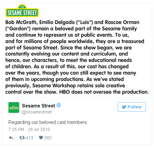 Το Sesame Street εξέδωσε μια δήλωση για την απόφασή του, απαλλάσσοντας από οποιαδήποτε κατηγορία το HBO, λέγοντας πως ο Μπομπ, ο Λουίς και ο Γκόρντον παραμένουν αγαπημένα μέλη της οικογένειας του Sesame Street, και θα συνεχίσουν να τους αντιπροσωπεύουν σε δημόσιες εκδηλώσεις.