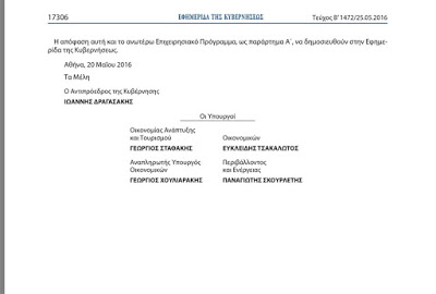 Στις 25 Μαΐου η κυβέρνηση δημοσιοποίησε την απόφαση στην Εφημερίδα της Κυβέρνησης, την οποία υπογράφουν ο αντιπρόεδρος Γιάννης Δραγασάκης και οι υπουργοί Γ.Σταθάκης (Οικονομίας), Ευ.Τσακαλώτος (Οικονομικών), Π.Σκουρλέτης (Περιβάλλοντος) και ο αναπληρωτής Οικονομικών Γ.Χουλιαράκης.