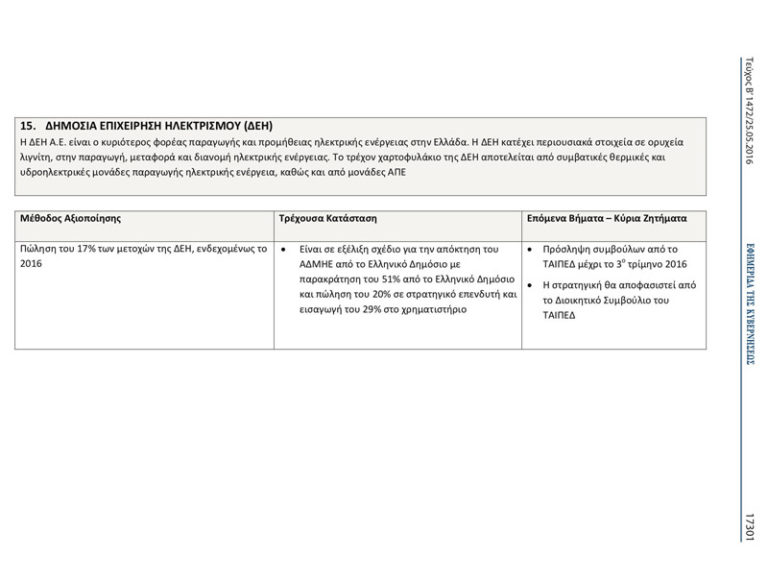 Μπορεί ο υπουργός Περιβάλλοντος Π.Σκουρλέτης να δηλώνει αντίθετος με την πώληση του 17% της ΔΕΗ, ωστόσο, στο σχετικό φύλλο της Εφημερίδας της Κυβερνήσεως με ημερομηνία 25 Μαΐου 2016, δημοσιεύεται η σχετική απόφαση που φέρει και την υπογραφή του.