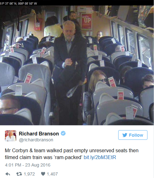 O Tζέρεμι Κόρμπιν, ηγέτης των Βρετανών Εργατικών ταξίδεψε με τρένο από το Λονδίνο στο Νιουκάστλ και έκατσε στο πάτωμα. Ισχυρίστηκε ότι δεν υπήρχαν θέσεις και ότι το τρένο σε γραμμή που λειτουργεί η Virgin του Ρίτσαρντ Μπράνσον, δεν εξυπηρετεί τον κόσμο. Η εταιρεία τον διέψευσε, δίνοντας στη δημοσιότητα εικόνες με τον Κόρμπιν να προσπερνά άδειες θέσεις. Ποιος είχε δίκιο;