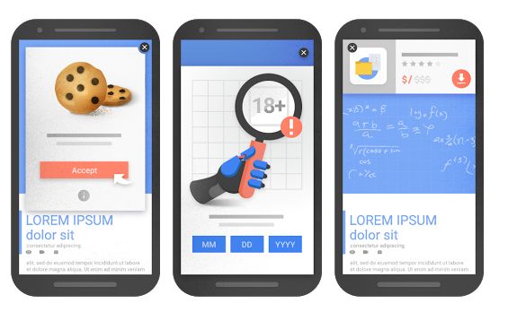 Ο product manager της Google Doantam Phan δίνει μερικά χαρακτηριστικά παραδείγματα pop up που θα στοιχίσουν θέσεις στα αποτελέσματα αναζήτησης και άλλα που δεν θεωρούνται ενοχλητικά. Τρία χαρακτηριστικά παραδείγματα pop up που δεν θα υποβαθμίζουν τη θέση ενός δικτυακού τόπου στα αποτελέσματα της Google από smartphone/tablet, παρά το γεγονός ότι στις δύο πρώτες περιπτώσεις επικαλύπτουν σχεδόν ή εξ ολοκλήρου το κυρίως περιεχόμενο. Στο τρίτο παράδειγμα, ένα pop up με «λογικό» μέγεθος κατά την Google.