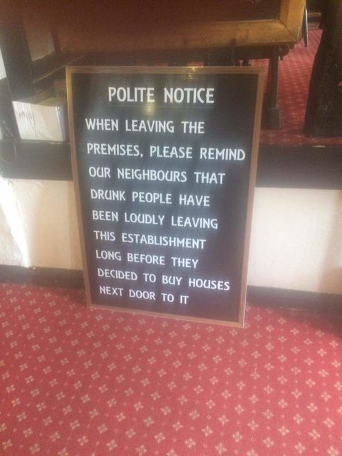 Ιδού τι έγραψε: «Ευγενική ανακοίνωση. Όταν αποχωρείτε από τη συγκεκριμένη επιχείρηση, υπενθυμίστε στους γείτονες ότι φασαριόζοι και μεθυσμένοι πελάτες έφευγαν από παμπ πολύ πριν αποφασίσουν να αγοράσουν διαμερίσματα δίπλα σε αυτές».