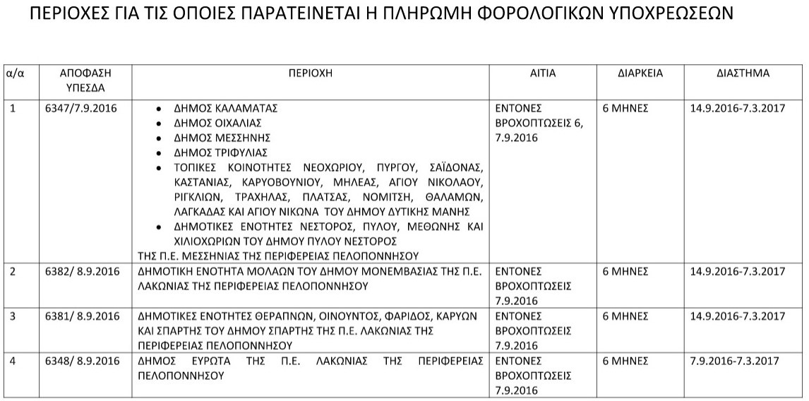 Υπογράφηκαν από τον αναπληρωτή υπουργό Οικονομικών Τ.Αλεξιάδη οι σχετικές υπουργικές αποφάσεις, με τις οποίες παρατείνεται κατά 6 μήνες η προθεσμία πληρωμής φορολογικών υποχρεώσεων σε συγκεκριμένες περιοχές, λόγω των πρόσφατων καταστροφών από φυσικά φαινόμενα.
