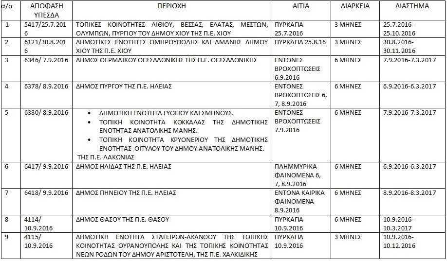Οι αποφάσεις αυτές εκδόθηκαν, βάσει σχετικών αποφάσεων του Υπουργείου Εσωτερικών και Διοικητικής Ανασυγκρότησης (Γενική Γραμματεία Πολιτικής Προστασίας) το οποίο και κηρύσσει την κατάσταση Έκτακτης Ανάγκης Πολιτικής Προστασίας, την περιοχή και το χρονικό διάστημα.