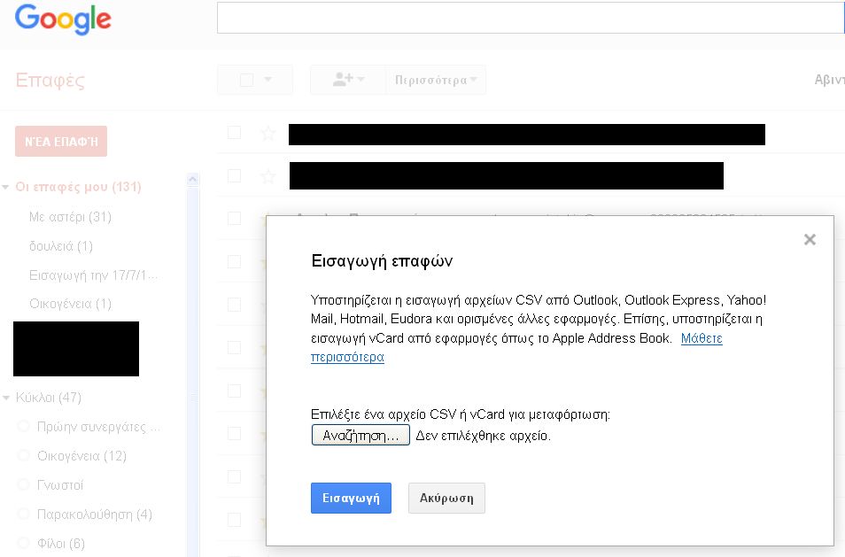 Αφού κατεβάσετε το CSV (yahoo_contacts.csv), μπείτε στο λογαριασμό σας στο Gmail και μεταβείτε στις Επαφές https://www.google.com/contacts/u/0/?cplus=0#contacts. Επιλέξτε Περισσότερα και Εισαγωγή και υποδείξτε το μονοπάτι που οδηγεί στο yahoo_contacts.csv (συνήθως στα Ληφθέντα αρχεία/Downloads του υπολογιστή σας στα Έγγραφά μου).