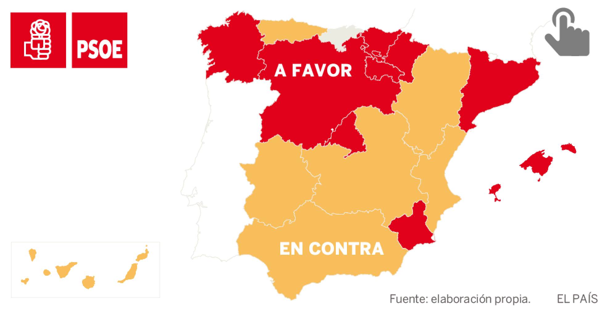 Ιδού ένα γράφημα της El Pais με τη διάσπαση στο PSOE. Με κόκκινο όσοι είναι υπέρ της πρότασης Σάντσεθ για συνέδριο, με πορτοκαλί όσοι είναι εναντίον: