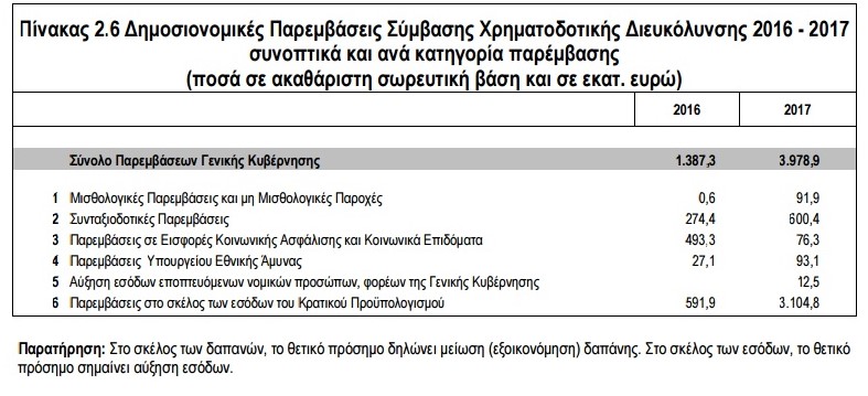 Ωστόσο, αναφέρεται στο κείμενο, θα πρέπει να επισημανθεί ότι τα μη φορολογικά έσοδα καθώς και τα μη τακτικά έσοδα στο 2017, είναι μειωμένα σε σχέση με αυτά του 2016, λόγω των μειωμένων προβλέψεων είσπραξης κατά 375 εκατ. ευρώ από το μέρισμα της Τράπεζας της Ελλάδος και κατά 131 εκατ. ευρώ από τις προμήθειες κρατικών εγγυήσεων στο πρόγραμμα ενίσχυσης της ρευστότητας από τη χρηματοπιστωτική κρίση, αντίστοιχα.