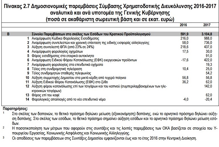 Ειδικότερα, το σύνολο των παρεμβάσεων που προβλέπονται για τη διετία 2016-2017 ανέρχεται αθροιστικά στα 3,978 δισ. ευρώ (εκ των οποίων 1,387 δισ. ευρώ στη διάρκεια του τρέχοντος έτους). Τα «καθαρά» μέτρα που έρχονται το 2017, αγγίζουν τα 2,591 δισ. ευρώ, αφορώντας κυρίως νέους φόρους, αλλά και περικοπές δαπανών.