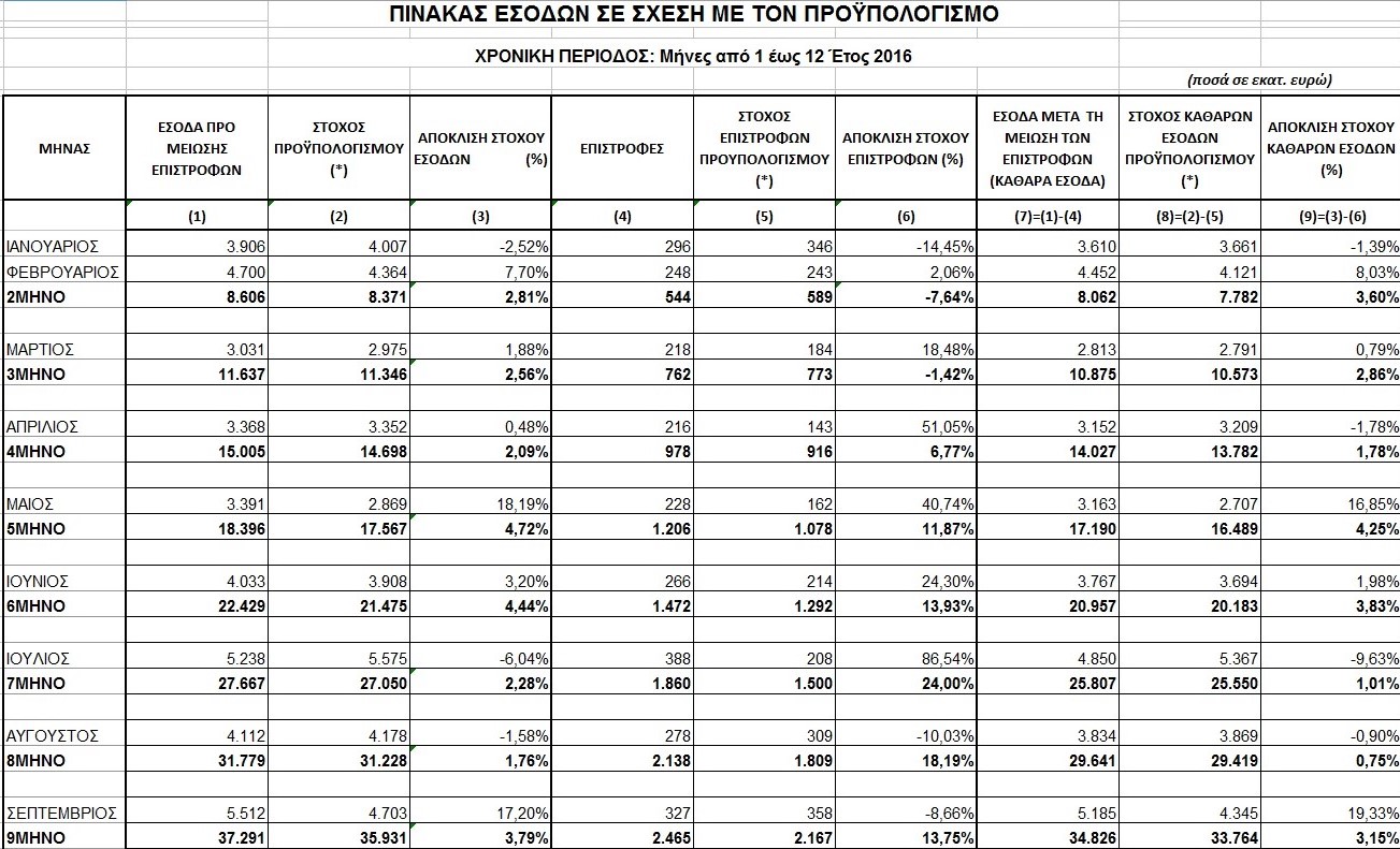 Σε επίπεδο εννεαμήνου Ιανουάριος-Σεπτέμβριος 2016 τα καθαρά έσοδα ξεπερνούν το στόχο κατά 3,15% και ανέρχονται σε 34,826 δισ. ευρώ (έναντι στόχου για 33,764 δισ. ευρώ).