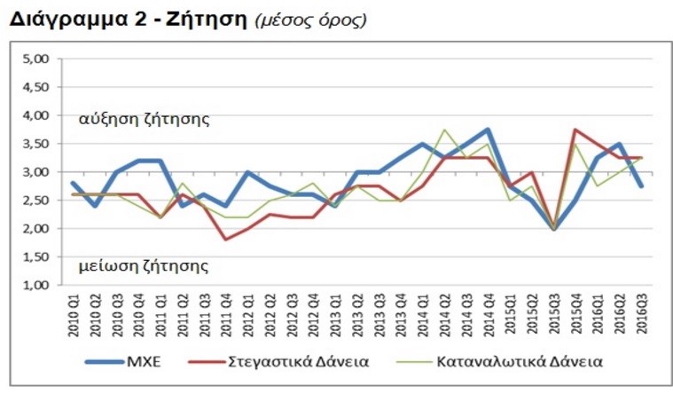 Ειδικότερα, σύμφωνα με τα στοιχεία της έρευνας της Τράπεζας της Ελλάδος το γ’ τρίμηνο τόσο τα κριτήρια χορήγησης δανείων προς τις μη χρηματοπιστωτικές επιχειρήσεις όσο και η ζήτηση για δάνεια από τις μη χρηματοπιστωτικές επιχειρήσεις (ΜΧΕ) παρέμειναν σχεδόν αμετάβλητα σε σχέση με το δεύτερο τρίμηνο του 2016, εξέλιξη σύμφωνη με τις προσδοκίες που είχαν διατυπωθεί στην έρευνα του προηγούμενου τριμήνου.