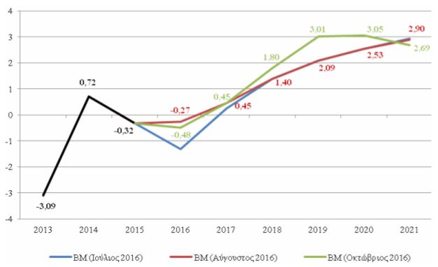 Για το 2016 αναμένεται ο ρυθμός μεταβολής του ΑΕΠ να είναι στο -0,48% (τον Αύγουστο προβλεπόταν ύφεση της τάξης του -0,27% και το ν Ιούλιο ύφεση της τάξης του -1,31%), ενώ από το 2018 και έπειτα αναμένονται υψηλότεροι ρυθμοί μεγέθυνσης (με εξαίρεση το έτος 2021). Παρατηρείται λοιπόν μια βραχυχρόνια επιδείνωση (όπως είχαμε προβλέψει στα προηγούμενα σημειώματα) σε σχέση με τις εκτιμήσεις του Αυγούστου. Μακροχρόνια όμως αναμένεται μια βελτίωση σε σχέση με τις προηγούμενες εκτιμήσεις.