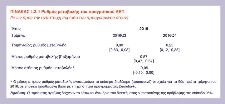 Όπως αναφέρεται στην έκθεση, με βάση τις εκτιμήσεις (όπως παρουσιάζονται στον Πίνακα 1.3.1), και έχοντας ενσωματώσει τα δημοσιευμένα στοιχεία για το πρώτο εξάμηνο του 2016, ο μέσος ρυθμός μεταβολής του πραγματικού ΑΕΠ για το δεύτερο εξάμηνο του 2016 προβλέπεται στο 0,6%, με τις επιμέρους εκτιμήσεις για το τρίτο και τέταρτο τρίμηνο να κυμαίνονται στο 0,9% και 0,3%, ως προς τις αντίστοιχες περιόδους του 2015.