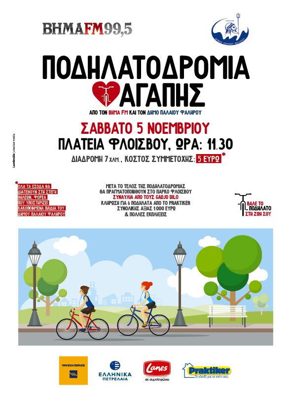 Αυτό τον καλό σκοπό έχει η «Ποδηλατοδρομία Αγάπης» που διοργανώνεται το Σάββατο 5 Νοεμβρίου από τον BHMA FM και τον Δήμο Παλαιού Φαλήρου στις 11 το πρωί.