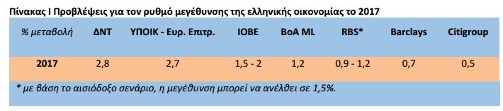 «Η κυβέρνηση και η ΤτΕ αναμένουν σχεδόν αλματώδη ανάπτυξη το 2017 κατά 2,7% του ΑΕΠ. Την ίδια αισιόδοξη πρόβλεψη περιέχει το Σχέδιο Προϋπολογισμού 2017 (Οκτώβριος 2016). Το Διεθνές Νομισματικό Ταμείο (ΔΝΤ) μάλιστα, υπερθεματίζει» αναφέρεται στην έκθεση.