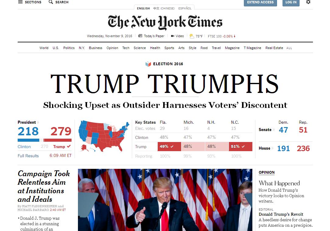 Στις ΗΠΑ, οι μεγάλες εφημερίδες επισημαίνουν την ήττα των πολιτικών και μιντιακών ελίτ. «Πρόεδρος Ντόναλντ Τραμπ. Τρεις λέξεις που ήταν αδιανόητες για δεκάδες εκατομμύρια Αμερικανούς» γράφει η New York Times παραδεχόμενη «ένα εξευτελιστικό πλήγμα για τα μέσα ενημέρωσης, τους δημοσκόπους και τη δημοκρατική ελίτ».