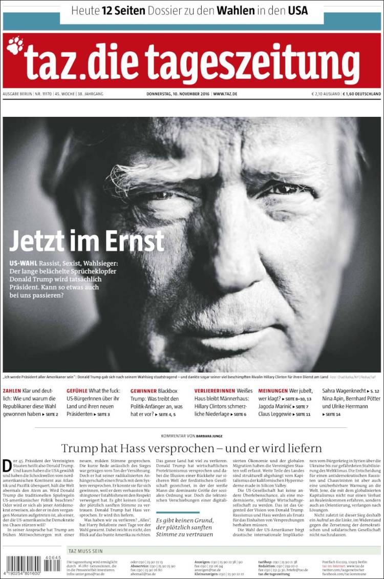 To πρωτοσέλιδο της γαλλικής Liberation την Πέμπτη: Το πρωτοσέλιδο της γερμανικής Tageszeitung την Πέμπτη: «Σοβαρά τώρα», με τίτλο κειμένου «Ο Τραμπ υποσχέθηκε μίσος, και θα το φέρει».