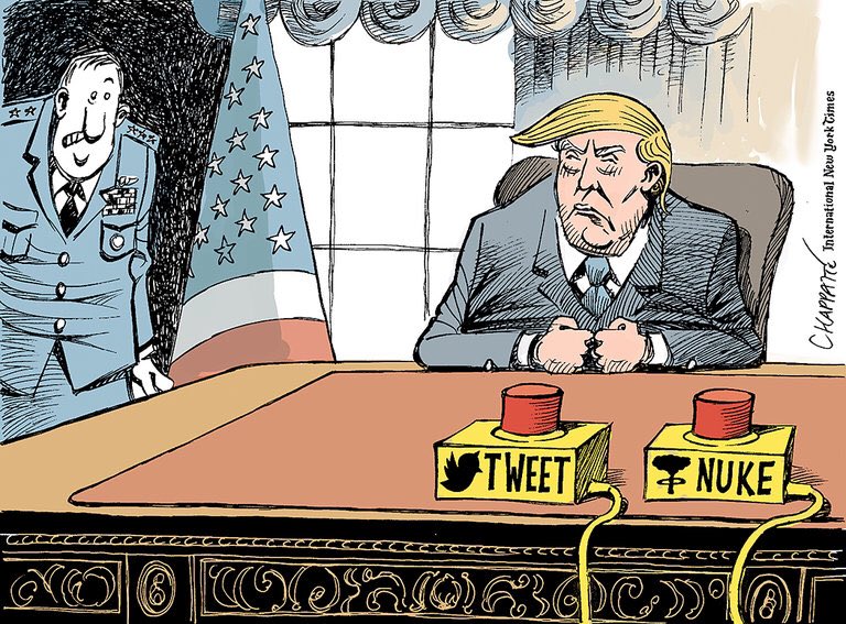 Σκίτσο του καναδού γελοιογράφου Μάικλ ντε Αντέρ: «Το ήξερα ότι με θες» Άλλο σκίτσο του Πατ Τσαπάτι για τους New York Times, που παίζει με την φράση «the clown is out of box» -χρησιμοποιείται για ένα ξαφνικό «κακό» που δεν μαζεύεται: