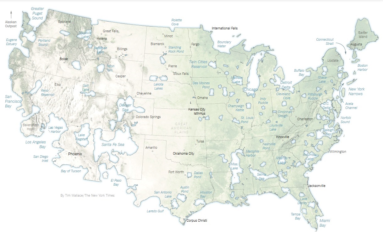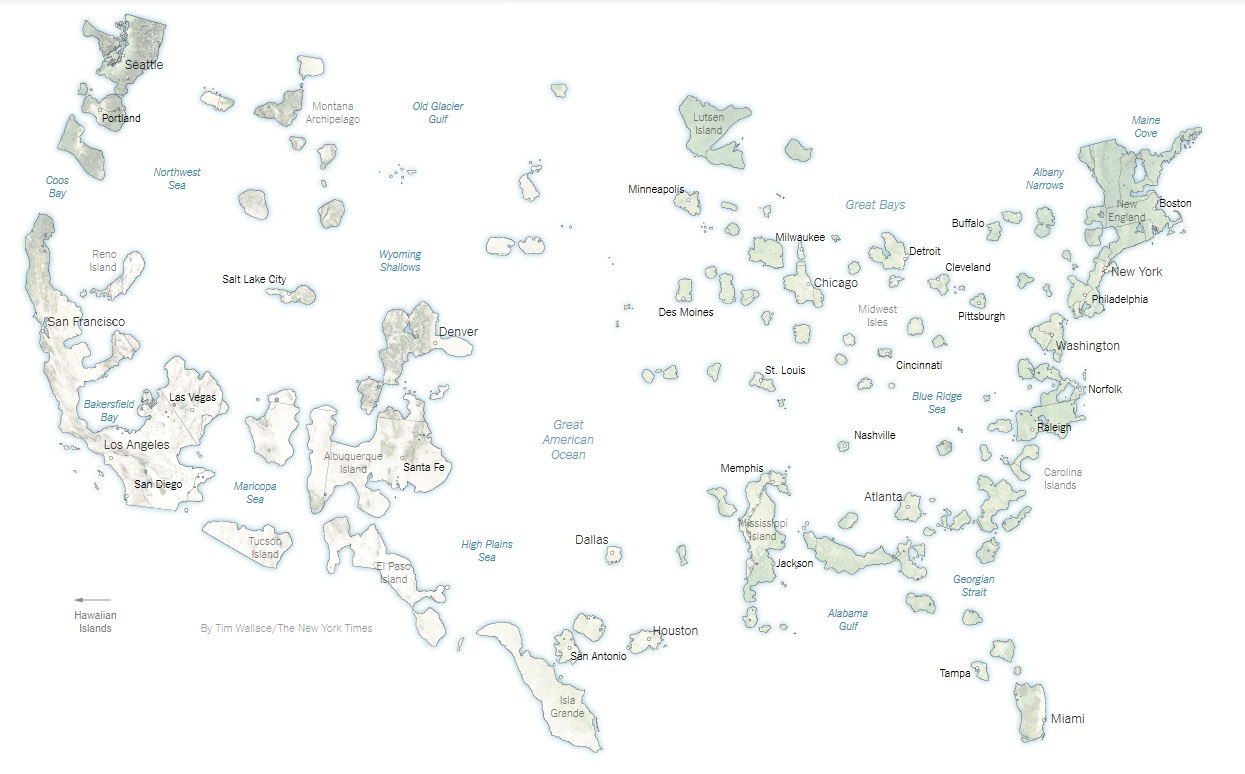 Οι ΝΥΤ αποτύπωσαν, με την υπογραφή του Τιμ Γουάλας, το εκλογικό αποτέλεσμα βάσει περιφερειών, κι όχι πολιτειών, ώστε να δείξουν πού επικράτησε η Κλίντον και πού ο Τραμπ. Σχημάτισαν έτσι τους δύο χάρτες αυτών των δύο διαφορετικών χωρών.