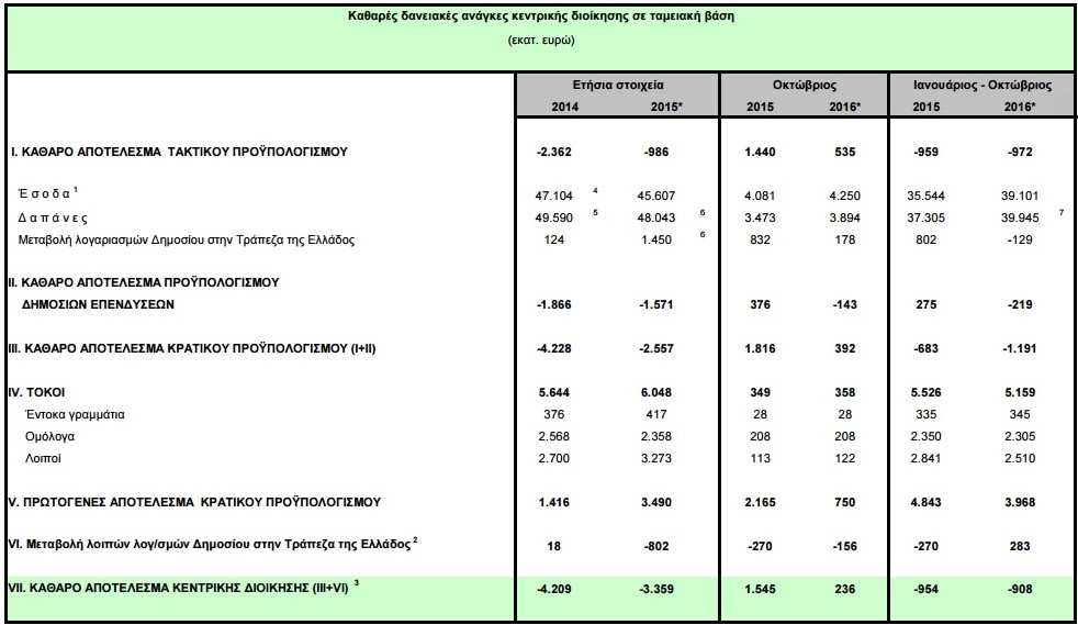 Ειδικότερα, όπως σημειώνει η ΤτΕ, την περίοδο Ιανουαρίου-Οκτωβρίου 2016 το ταμειακό αποτέλεσμα της κεντρικής διοίκησης παρουσίασε έλλειμμα 908 εκατ. ευρώ, έναντι ελλείμματος 954 εκατ. ευρώ την αντίστοιχη περίοδο του 2015.