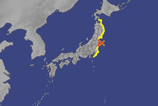 O χάρτης πρόγνωσης τσουνάμι της Ιαπωνικής Μετεωρολογικής Υπηρεσίας. Το κόκκινο σημαίνει κύματα ύψους 1-3 μέτρων. Το κίτρινο 0,2 -1 μέτρο.
