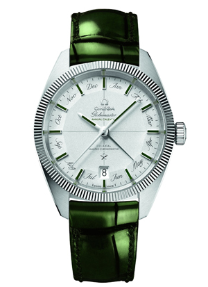 Globemaster Annual Calendar συλλεκτικής έκδοσης Με μία κάσα από πλατίνα 950, αυτή η συλλεκτική έκδοση του Globemaster στα 41mm, έχει ως χαρακτηριστικό τη γυαλισμένη κυματιστή στεφάνη και το αμμοβολισμένο πολυεδρικό και κεκλιμένο καντράν επίσης από πλατίνα 950, εμπνευσμένο από το πρώτο μοντέλο Constellation του 1952. Λόγω της λειτουργίας του ετήσιου ημερολογίου που διαθέτει, κάθε μία από τις έδρες περιλαμβάνει έναν μήνα του χρόνου. Βρίσκουμε επίσης, στο καντράν, το χαρακτηριστικό αστέρι για το μοντέλο Constellation σε λευκό χρυσό 18Κ όπως και το λογότυπο της OMEGA. Οι δείκτες αλλά και οι ενδείξεις που είναι γεμισμένες με πράσινο σμάλτο είναι επίσης από λευκό χρυσό 18Κ. Το οπίσθιο καπάκι της κάσας περιλαμβάνει ένα μενταγιόν γεμισμένο με πράσινο σμάλτο από λευκό χρυσό 18Κ που απεικονίζει το κεντρικό αστεροσκοπείο της Γενεύης. Το ρολόι διαθέτει ένα πράσινο δερμάτινο λουρί και λειτουργεί με το μηχανισμό 8923 Co-Axial Master Chronometer της OMEGA, έχοντας λειτουργία ετήσιου ημερολογίου, αλλά και επαναστατική αντι-μαγνητική τεχνολογία.