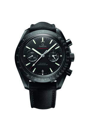 Στη ματ ταχυμετρική κλίμακα που είναι κατασκευασμένη από νιτρίδιο του χρωμίου – ένα από τα πιο χαρακτηριστικά σχεδιαστικά γνωρίσματα του Speedmaster – ξεχωρίζει η κεραμική και γυαλισμένη στεφάνη που είναι τοποθετημένη στην κεραμική κάσα των 44,25mm όπου εναλλάσσονται ματ και γυαλισμένες επιφάνειες. Σκαλισμένες στο κεραμικό οπίσθιο καπάκι λίγο πάνω από το κρύσταλλο σαπφείρου υπάρχουν οι λέξεις «Dark Side of the Moon» – ο απαραίτητος φόρος τιμής στη κληρονομιά και στο σαγηνευτικό σχεδιασμό του Speedmaster. Το ρολόι διαθέτει ένα επικαλυμμένο με νάιλον λουρί και λειτουργεί με τον μηχανισμό 9300 Co-Axial της OMEGA.