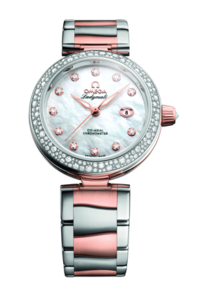Το De Ville Ladymatic Co-Axial 34 mm Όταν το μοντέλο Ladymatic πρωτοπαρουσιάστηκε το 1955, έγινε το καθοριστικό ρολόι στη γυναικεία μόδα. Έξι δεκαετίες από τότε, και ακόμη διατηρεί κάθε γραμμάριο της χάρης και του σαγηνευτικού του στυλ. Σε αυτό το μοντέλο, η ατσάλινη κάσα ενισχύεται από ένα ματ μεταλλικό μπρασελέ με κυματοειδής άκρες, δημιουργημένο από ατσάλι και χρυσό Sedna™ 18Κ. Χρυσό Sedna™ συναντάμε επίσης και στους γυαλισμένους δείκτες σε μορφή άλφα, καθώς και στις 11 διαμαντένιες ενδείξεις ώρας. Ακτινοβολώντας γύρω από το λευκό καντράν από φίλντισι, η στεφάνη είναι στρωμένη με διαμάντια, ενώ ένα διαμάντι εξαιρετικής κοπής OMEGA είναι τοποθετημένο μέσα στην γυαλισμένη κορώνα. Στο μοντέλο De Ville Ladymatic Co-Axial 34 mm, μπορούμε να δούμε τις ημέρες από το παράθυρο στη θέση ώρας 3, ενώ στο εσωτερικό του υπάρχει ο μηχανισμός Co-Axial 8520 της OMEGA.