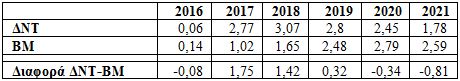 Από τα παραπάνω προκύπτουν οι εξής παρατηρήσεις: α) Το ΔΝΤ είναι περισσότερο αισιόδοξο όχι μόνο για το 2017 (εκτιμά υψηλότερο ρυθμό μεγέθυνσης κατά 1,75%), αλλά και για το 2018 (υψηλότερος ρυθμός μεγέθυνσης κατά 1,42%) και το 2019 (υψηλότερος ρυθμός μεγέθυνσης κατά 0,32%). β) Οι περισσότερο αισιόδοξες εκτιμήσεις του ΔΝΤ καταλήγουν στο ότι το πραγματικό ΑΕΠ το 2021 θα είναι υψηλότερο κατά περίπου 5,7 δις ευρώ (σύμφωνα με το ΟΕ 210,6 δις ενώ σύμφωνα με το ΒΜ 204,9 δις). Η αντίστοιχη διαφορά το 2019 αναμένεται να είναι 7,3 δις (201,6 σύμφωνα με το ΔΝΤ και 194,3 δις σύμφωνα με το ΒΜ). γ) Οι υψηλότερες εκτιμήσεις οφείλονται στο ότι το ΔΝΤ εκτιμά ιδιαίτερα υψηλότερες επενδύσεις σε σχέση με το ΒΜ. Επίσης, το ΔΝΤ εκτιμά ότι οι καθαρές εξαγωγές θα είναι περίπου 3 δις ευρώ υψηλότερες κάθε χρόνο. Επίσης, το ΔΝΤ εκτιμά αρκετά χαμηλότερα επίπεδα ιδιωτικής κατανάλωσης σε σχέση με το ΒΜ, ιδιαίτερα μετά το 2019. δ) Το ΒΜ εμφανίζεται περισσότερο αισιόδοξο από το ΔΝΤ μετά το 2020 λόγω του μεγαλύτερου ρυθμού μεγέθυνσης των βασικών παραγόντων που διαμορφώνουν το ΑΕΠ. Στο ΒΜ η οικονομία λόγω των χαμηλότερων ρυθμών μεγέθυνσης μέχρι το 2019 έρχεται με μεγαλύτερη δυναμική τα έτη 2020 και 2021.