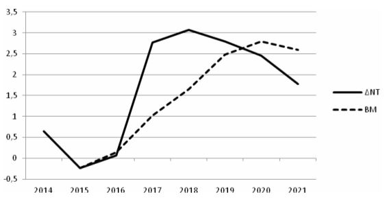 Το ΒΜ μοντέλο, εξετάζει εάν υπάρχει απόκλιση του πρωτογενούς πλεονάσματος από τους στόχους που τέθηκαν στο “Supplemental Memorandum of Understanding” για την ελληνική οικονομία (16/06/2015). Στις εκτιμήσεις του Νοεμβρίου του 2016 προκύπτει ότι το 2018 η απόκλιση του πρωτογενούς πλεονάσματος από το στόχο αναμένεται να είναι περίπου στο -0,56% του ΑΕΠ και άρα θα πρέπει να περιμένουμε από το 2019 και έπειτα (όχι δηλαδή από το 2018) την υιοθέτηση ενός νέου πακέτου δημοσιονομικής συρρίκνωσης (εφαρμογή δημοσιονομικού κόφτη). Η εφαρμογή του πακέτου αυτού θα αφορά 0,97 δις ευρώ εντός του 2018 και υποθέτουμε ότι τα μέτρα αυτά θα διαρκέσουν για όλα τα επόμενα έτη. Επίσης, διαπιστώνεται ότι το έτος 2016 και από το 2019 έως το 2021, το πρωτογενές πλεόνασμα είναι υψηλότερο από το στόχο του προγράμματος προσαρμογής και η διαφορά αυτή διατίθεται στη δημόσια κατανάλωση. Υποθέτουμε επίσης ότι τα spreads των 10ετών ελληνικών ομολόγων θα κυμαίνονται στην περιοχή του 4% από το τρίτο τρίμηνο του 2017 και έπειτα.