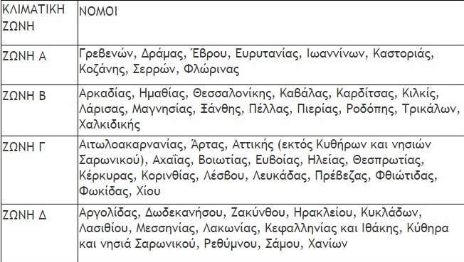 -Στην τέταρτη κλιματική ζώνη οι νομοί: Αργολίδας, Δωδεκανήσου, Ζακύνθου, Ηρακλείου, Κυκλάδων, Λασιθίου, Μεσσηνίας, Λακωνίας, Κεφαλληνίας και Ιθάκης, Κύθηρα και νησιά Σαρωνικού, Ρεθύμνου, Σάμου, Χανίων Σάμου, Χανίων