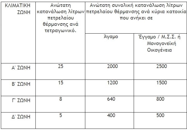 -Στην πρώτη ζώνη η ανωτάτη κατανάλωση λίτρων πετρελαίου ανά τετραγωνικό μέτρο είναι στα 25 λίτρα με ανωτάτη συνολική κατανάλωση για το άγαμο τα 2000 λίτρα και τους έγγαμους και τις μονογονεικές οικογένειες στα 2500 λίτρα.