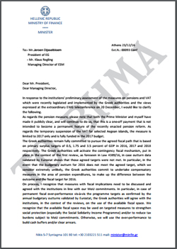 «Οι ελληνικές Αρχές αναγνωρίζουν πλήρω ςότι τα ανακοινωθέντα των Eurogroup της 25ης Μαίου και της 5ης Δεκεμβρίου βασίζονται στη διαρκή τήρηση των δεσμεύσεων του μνημονίου» τονίζει ο υπουργός και κλείνοντας αναφέρει: «Ελπίζω ότι αυτές οι διασαφηνίσεις θα καθησυχάσουν το Eurogroup για την πλήρη δέσμευσή μας να παραμείνουμε σε συμμόρφωση με τις υποχρεώσεις μας στο πλαίσιο του Μνημονίου, τόσο όσον αφορά την ουσία, καθώς και τη διαδικασία της συνεργασίας με τους εταίρους μας»…