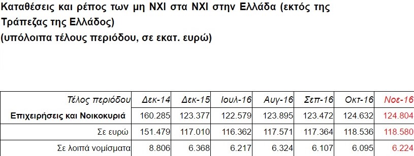 Ωστόσο, το ύψος των καταθέσεων εξακολουθεί να κινείται σε χαμηλά 13 ετών (Νοέμβριος 2003). Από το Δεκέμβριο του 2015 έως και τον Ιούλιο του 2016 οι εκροές των καταθέσεων από τις ελληνικές τράπεζες ανήλθαν στα 42 δισ. ευρώ.
