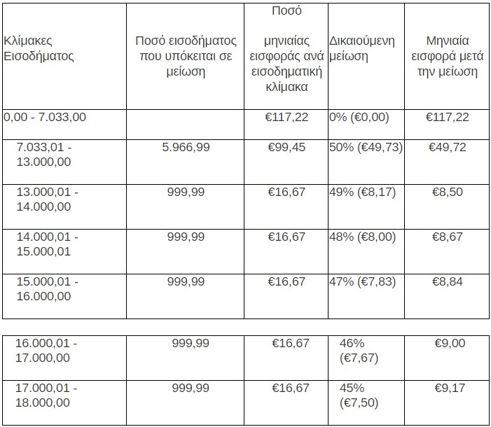 Ειδικότερα, για μηνιαίο εισόδημα που υπόκειται σε ασφαλιστικές εισφορές από 0,00 ευρώ έως 4.922,00 ευρώ δεν προβλέπεται μείωση της ασφαλιστικής εισφοράς, ενώ για εισόδημα από 4.922,01 ευρώ έως 13.000,00 ευρώ προβλέπεται μείωση της ασφαλιστικής εισφοράς κατά 50%. Για εισοδήματα άνω των €13.000,00 εφαρμόζονται τα ποσοστά μείωσης που αναφέρονται στον ανωτέρω Πίνακα.