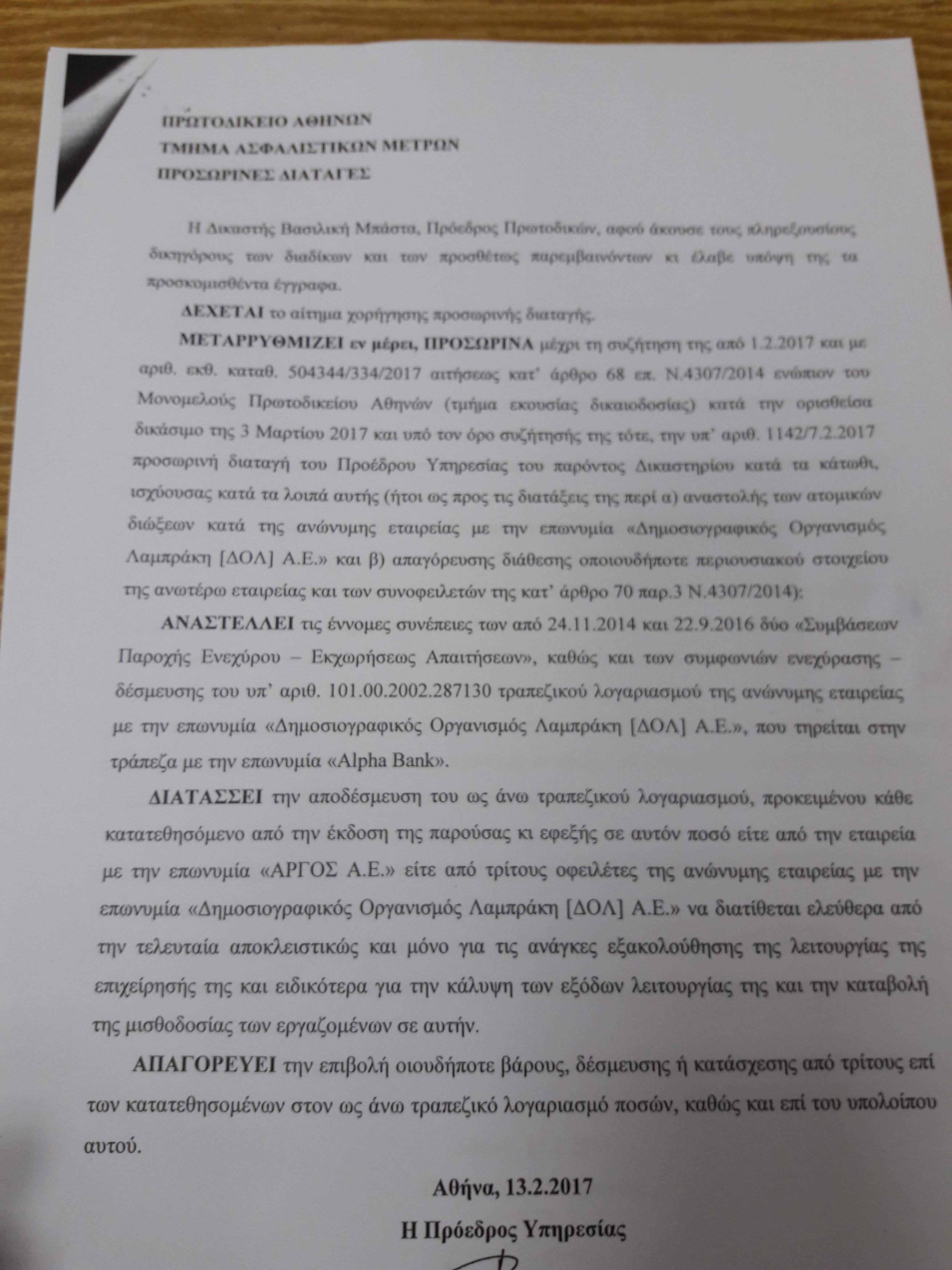 Με την απόφαση αυτή, παγώνουν τα ασφαλιστικά μέτρα, τα οποία είχαν ζητήσει οι τράπεζες και έτσι αποδεσμεύεται ένας λογαριασμός, απ’ όπου θα πληρώνονται οι δαπάνες για την έκδοση των εφημερίδων και των ιστοσελίδων του Οργανισμού.