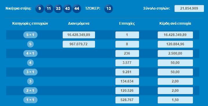 Έναν υπερτυχερό ανέδειξε η αποψινή κλήρωση του ΤΖΟΚΕΡ, ο οποίος κέρδισε το ποσό των 16.428.349,89 ευρώ. Άλλοι οκτώ παίκτες με «πεντάρι» θα εισπράξουν από 120.884,96 ευρώ έκαστος.