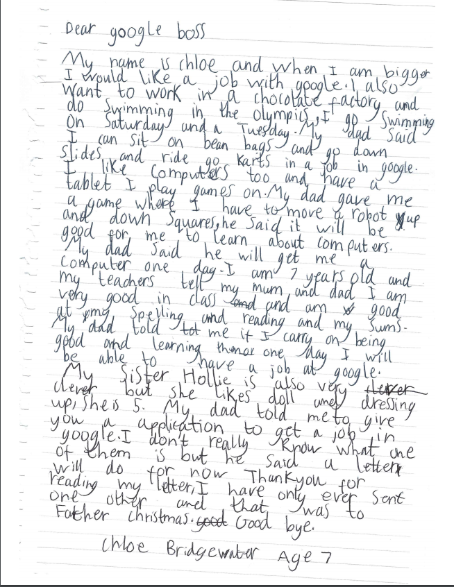Η 7χρονη Χλόη Μπριτζγουότερ υπέβαλλε το ιδιότυπο βιογραφικό της στον «αρχηγό της Google» διεκδικώντας, από τώρα για αργότερα, μια θέση εργασίας στα υπέροχα γραφεία της εταιρείας με τα χρωματιστά πουφ και τις γυαλιστερές τσουλήθρες.
