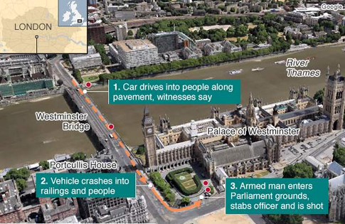 Το μεσημέρι της Τετάρτης αυτοκίνητο έπεσε πάνω σε περαστικούς και αστυνομικούς στη Γέφυρα του Ουεστμίνστερ. Στη συνέχεια, o άνδρας βγήκε από το αυτοκίνητο και έτρεξε έξω από το Κοινοβούλιο, όπου επιτέθηκε με μαχαίρι κατά φρουρού του Κοινοβουλίου. Αυτόπτες μάρτυρες σημειώνουν ότι ακούστηκαν τρεις πυροβολισμοί -πιθανότατα από άνδρες των δυνάμεων ασφαλείας.
