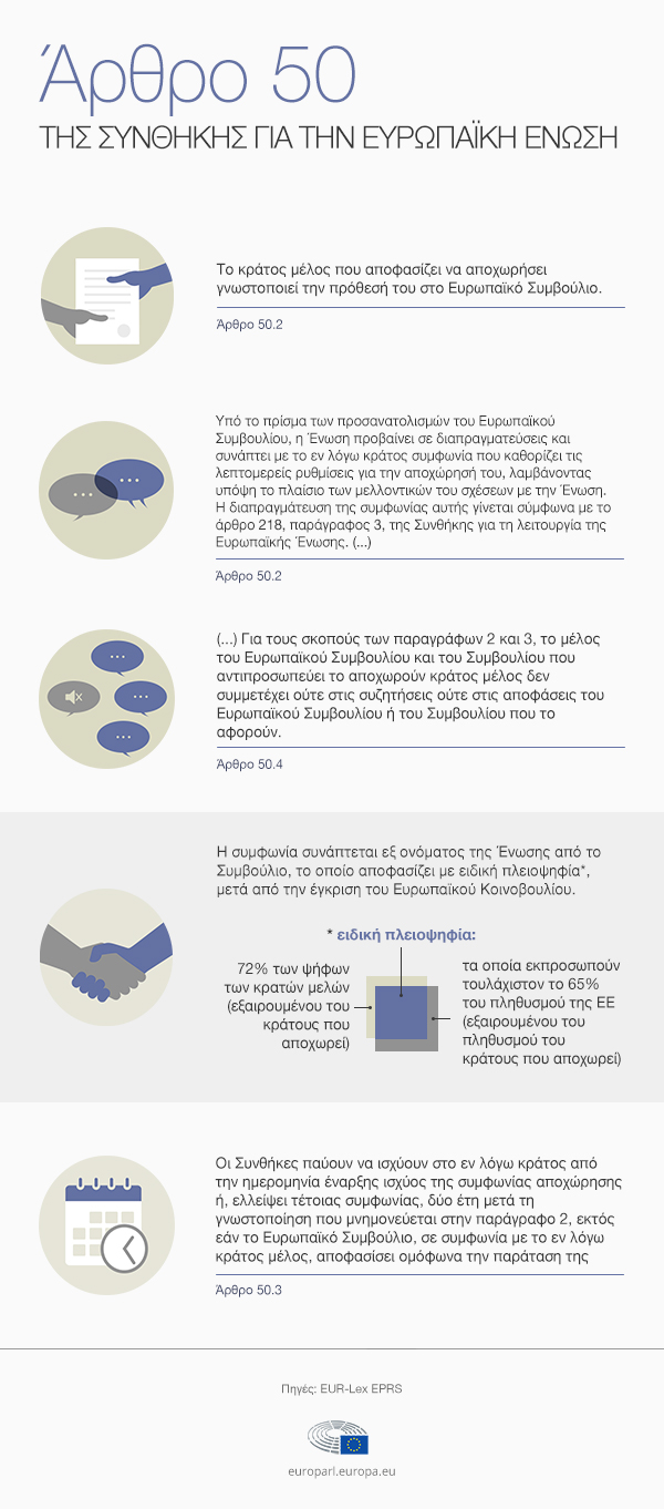 Το Άρθρο 50 ορίζει τη διαδικασία που πρέπει να ακολουθήσει ένα κράτος μέλος της Ευρωπαϊκής Ένωσης για να αποχωρήσει από αυτή. Κάθε κράτος μέλος μπορεί να αποφασίσει να αποχωρήσει από την Ένωση, σύμφωνα με τους εσωτερικούς συνταγματικούς του κανόνες. Μόλις ενεργοποιηθεί το Άρθρο 50, οι δύο πλευρές έχουν δύο χρόνια διαπραγματεύσεων. Ωστόσο, η περίοδος αυτή μπορεί να επεκταθεί με ομόφωνη απόφαση του Ευρωπαϊκού Συμβουλίου.