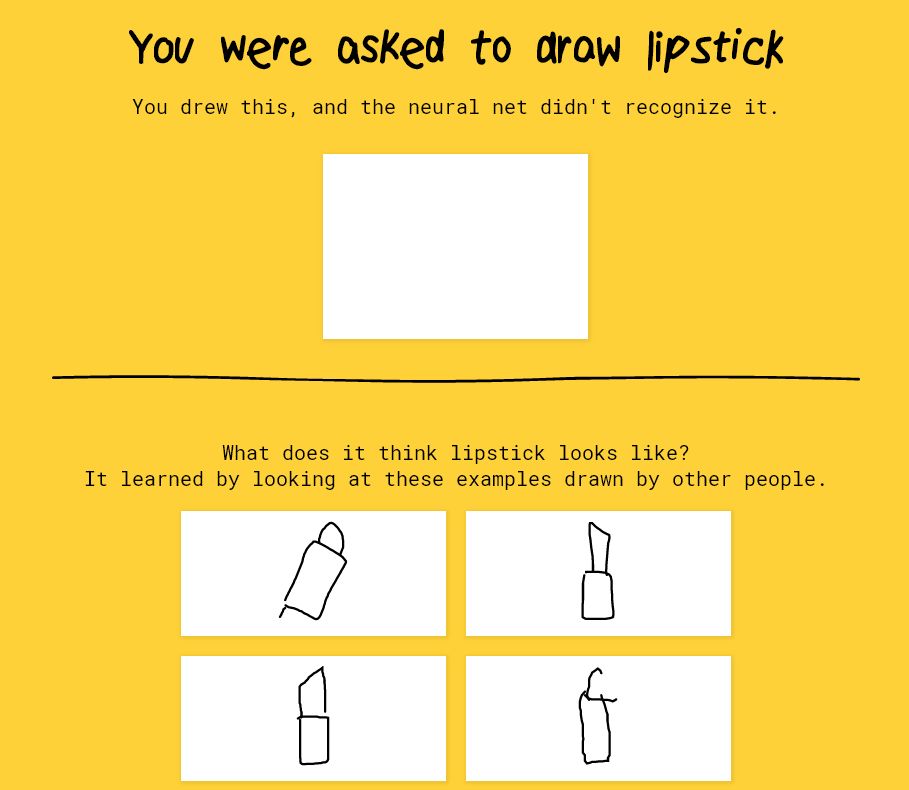 Το πείραμα τεχνητής νοημοσύνης που μαθαίνει σε ένα νευρωνικό δίκτυο να αναγνωρίζει σκίτσα βασίζεται στην υποβολή πολυάριθμων υποδειγμάτων, όχι για να μάθει πώς ακριβώς για παράδειγμα είναι ένα μούσι, μια μπανάνα, ένα πλυντήριο, ένα κραγιόν κ.λπ. αλλά για να έχει πολλά παραδείγματα για τον τρόπο που θα σχεδίαζε κανείς κάτι τέτοιο, ώστε να είναι σε θέση να το αναγνωρίσει.