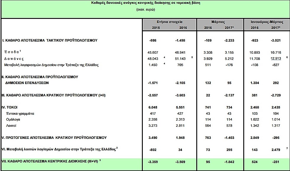 Την περίοδο Ιανουαρίου-Μαρτίου 2017 το ταμειακό αποτέλεσμα της κεντρικής διοίκησης παρουσίασε έλλειμμα 251 εκατ. ευρώ, έναντι πλεονάσματος 524 εκατ. ευρώ την αντίστοιχη περίοδο του 2016, σύμφωνα με τα στοιχεία της ΤτΕ. Το πρωτογενές έλλειμμα του κρατικού προϋπολογισμού σε ταμειακή βάση διαμορφώθηκε στα 295 εκατ. ευρώ έναντι πλεονάσματος 2,85 δισ. ευρώ το α΄τρίμηνο 2016. Οι πληρωμές ληξιπρόθεσμων οφειλών από το Δημόσιο το α' τρίμηνο ανήλθαν σε 432 εκατ. ευρώ.