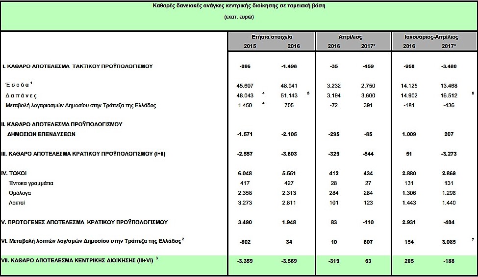 Ειδικότερα, σύμφωνα με τα στοιχεία της ΤτΕ, την περίοδο Ιανουαρίου-Απριλίου 2017 το ταμειακό αποτέλεσμα της κεντρικής διοίκησης παρουσίασε έλλειμμα 188 εκατ. ευρώ, έναντι πλεονάσματος 205 εκατ. ευρώ την αντίστοιχη περίοδο του 2016.